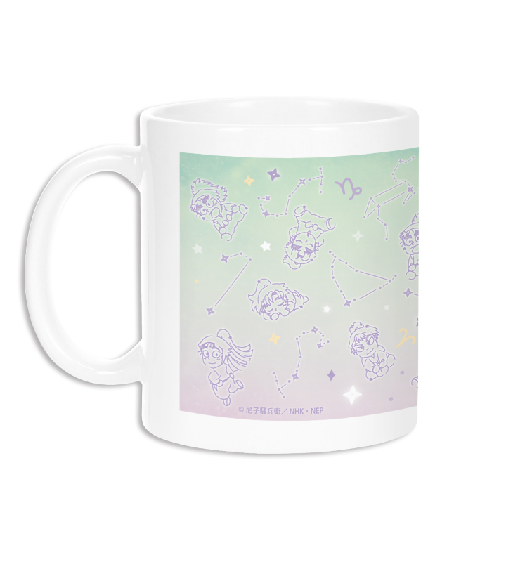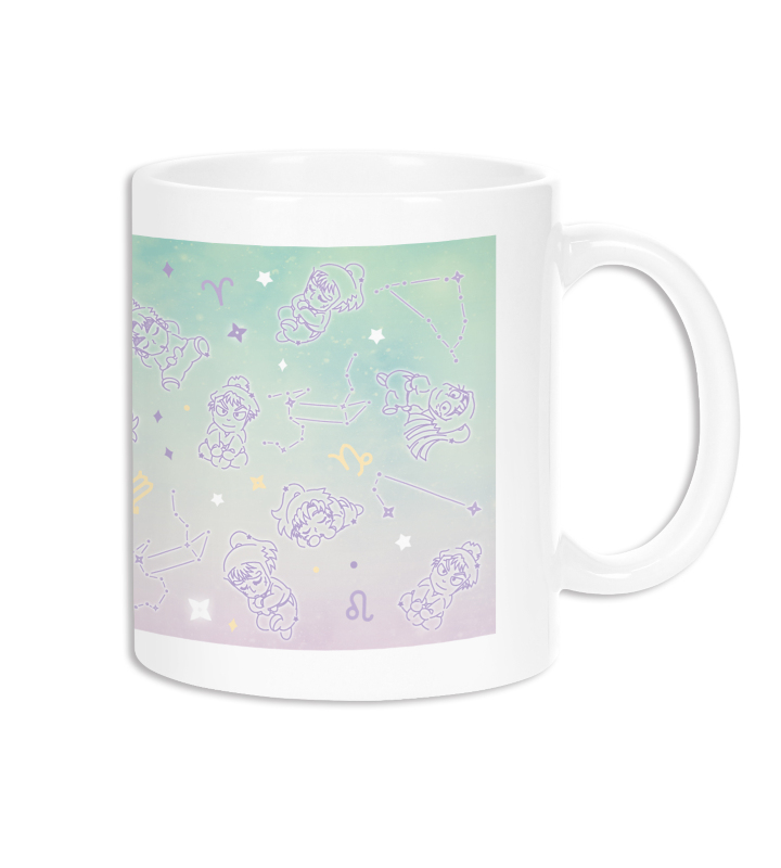 潮江文次郎、立花仙蔵、中在家長次、七松小平太、善法寺伊作、食満留三郎のちびキャライラストと星座を組み合わせてマグカップに仕上げました。