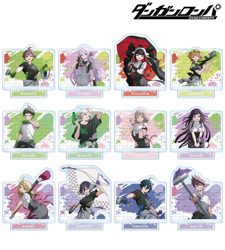 さくしゃ2先生描き起こしイラストの苗木誠、霧切響子、セレスティア・ルーデンベルク、不二咲千尋、日向創、狛枝凪斗、七海千秋、罪木蜜柑、赤松楓、王馬小吉、最原終一、百田解斗をアクリルスタンドに仕上げました。